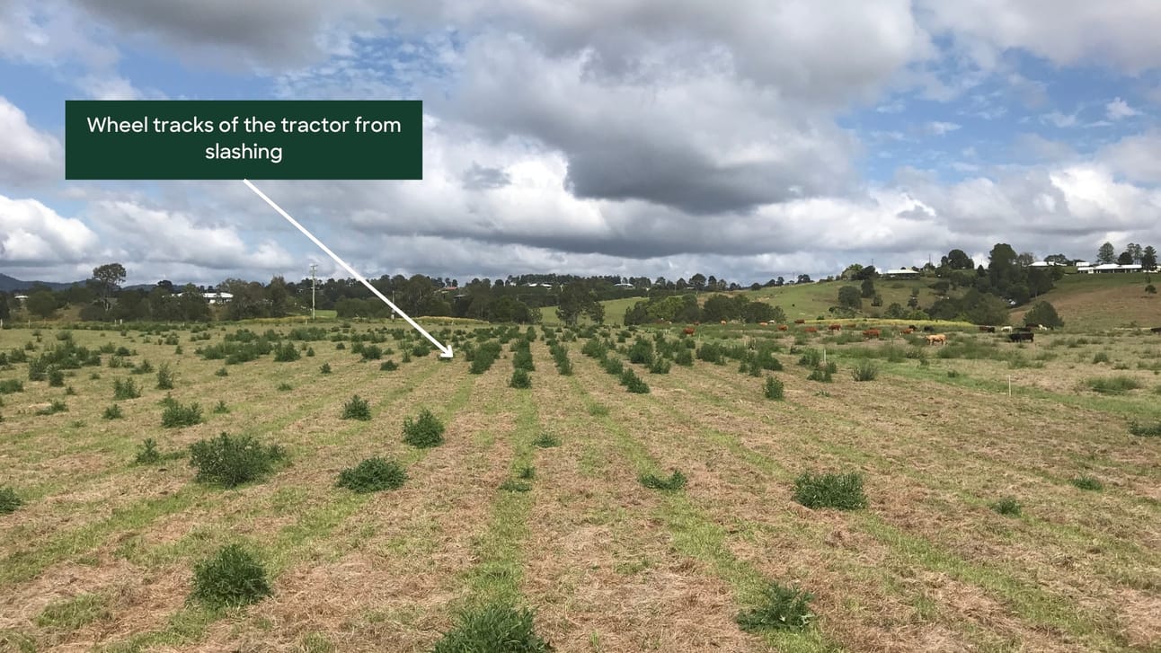 In this situation, after grazing this paddock, we went in and slashed it to remove the remaining dry matter that the cattle didn’t remove. At the time, the ground was moist and soft. As a result, the tractor left a wheel impression along its track and caused a small hard pan to form on the top of the soil.