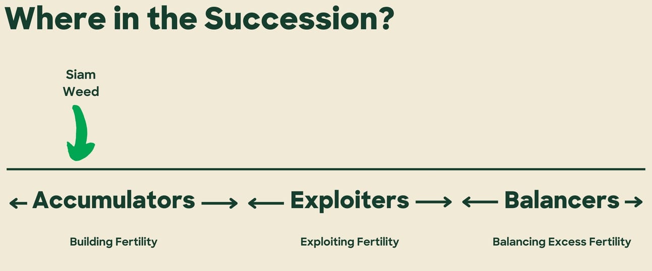 ⬆️ Increase soil fertility and organic matter. Siam Weed is often found colonising landscapes that were once forested but have been cleared. Its role is to start the successional process back to a forest, and a big part of that is increasing soil fertility—building up elements like carbon and nitrogen. One study found that areas with a severe invasion built carbon and nitrogen back up closer to levels observed in restored native forest plots3.