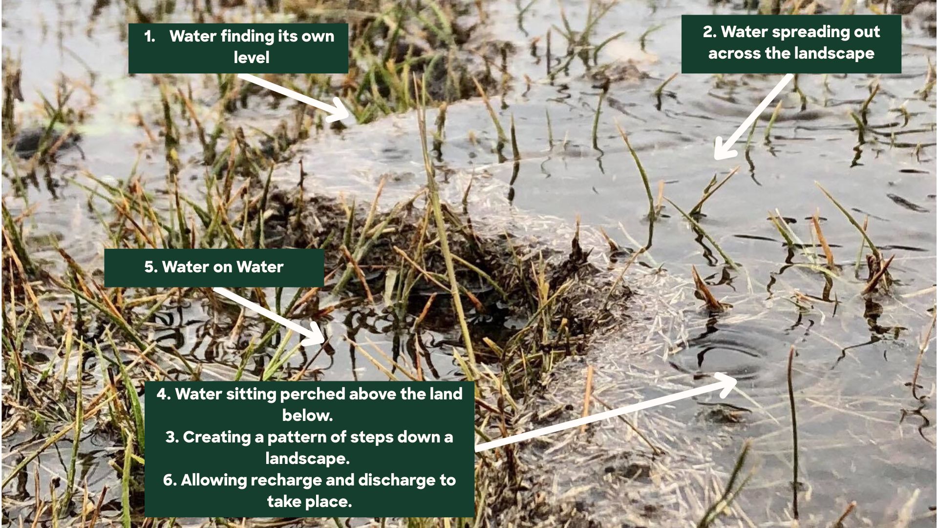 The first two processes, when combined with plants and organic matter, create an ideal environment for the subsequent processes to occur. The water level will rise behind the organic wall of material, creating a perched pond of water sitting below the area. This pattern will repeat over and over down a landscape, creating a stepped appearance, and it will allow for hydrological recharge to occur at the perched ponds of water, followed by discharge in the area below.