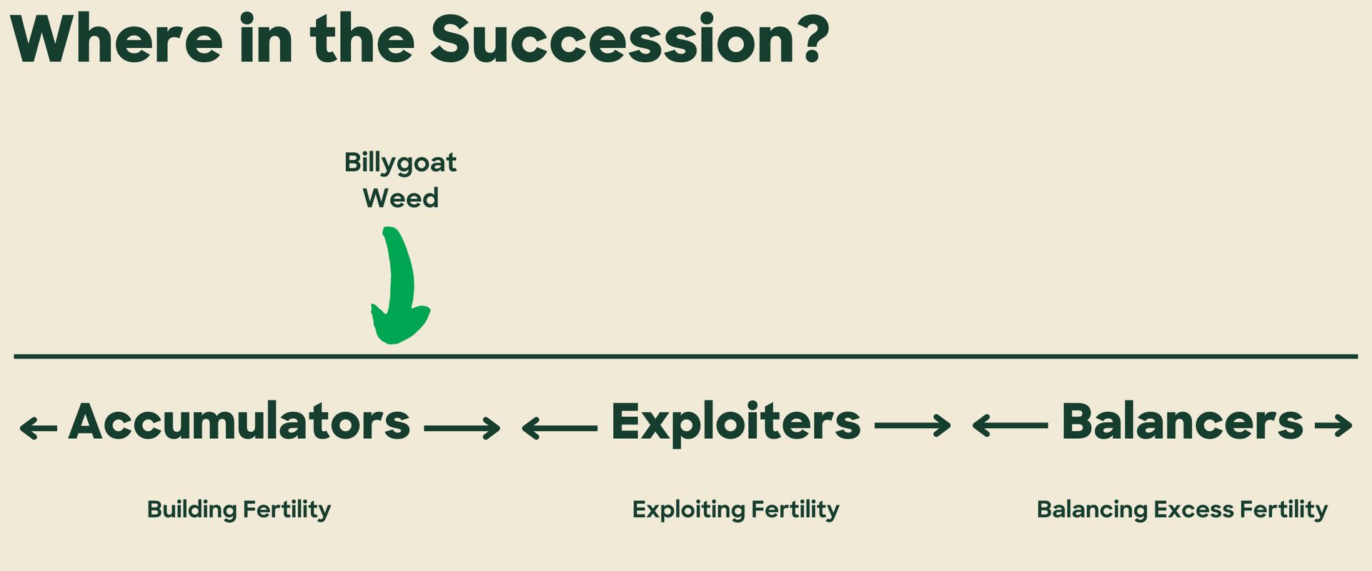 ⬆️ Increase soil organic matter. Given the Billygoat weeds' preference for growing in areas with higher fertility and excess nitrogen, we need to balance our carbon:nitrogen ratio and build up carbon levels. We can do this by increasing the amount of organic matter in the system by following a chop-and-drop pattern, cutting down the billygoat weed and returning it to the surface, or by bringing in external sources of fertility, such as compost, or by applying liquid carbon in the form of humates or humic acid to the area.